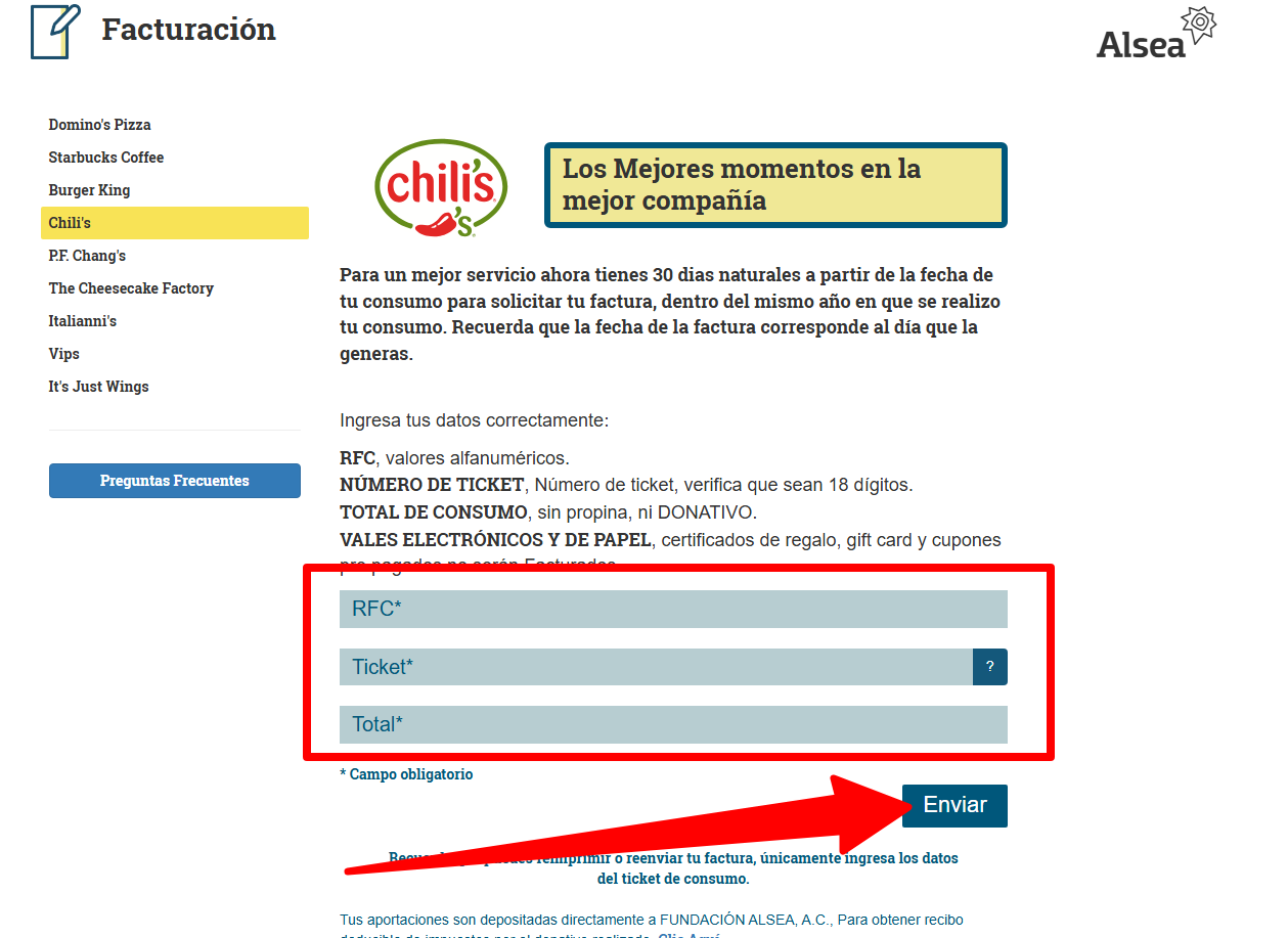 Ejemplo practico de como llenar el formulario del sistema para facturar ALSEA: