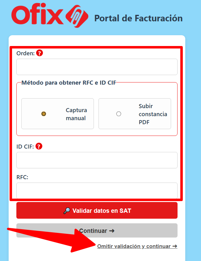 • Entrar al sistema de OFIX facturación correcto desde el botón "IR A FACTURAR", o encuentra la dirección en tu ticket de pago.