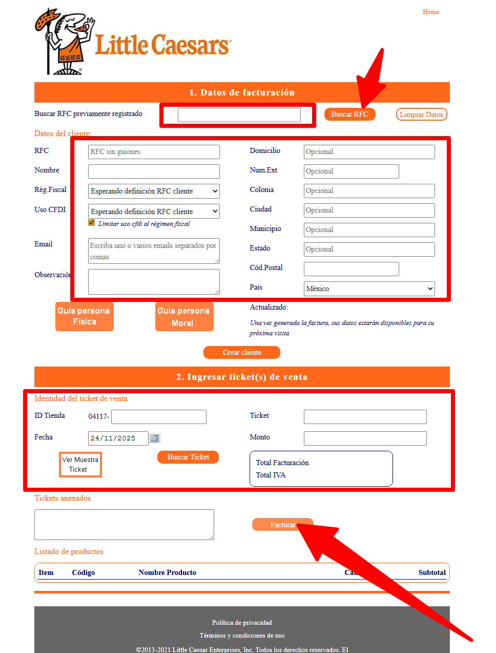 • Entrar al sistema de OPERACIONES LITTCE facturación correcto desde el botón "IR A FACTURAR", o encuentra la dirección en tu ticket de pago.