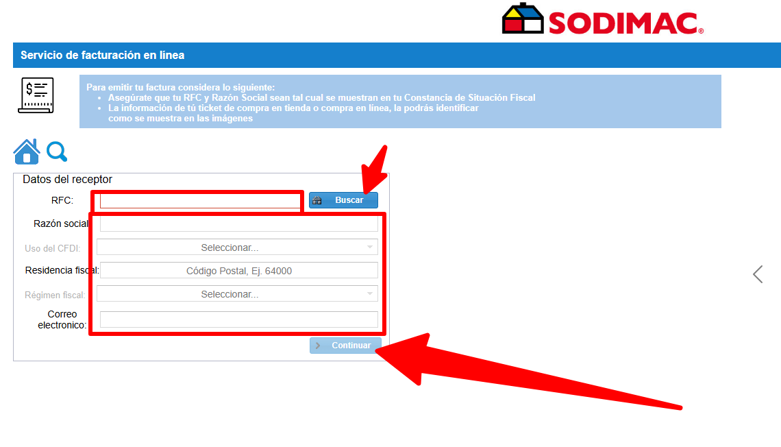 • Tener tu ticket SODIMAC de pago en buen estado para la captura de los datos correspondientes en el formulario del sistema de facturación.